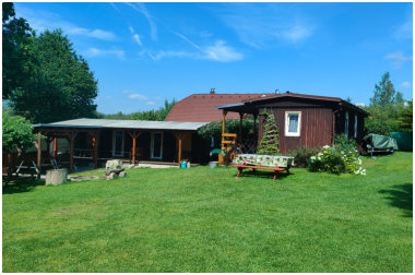 Na zahradě je ohniště a krb s posezením, sociální zařízení, kuchyňka s dvouplotýnkovým indukčním vařičem.